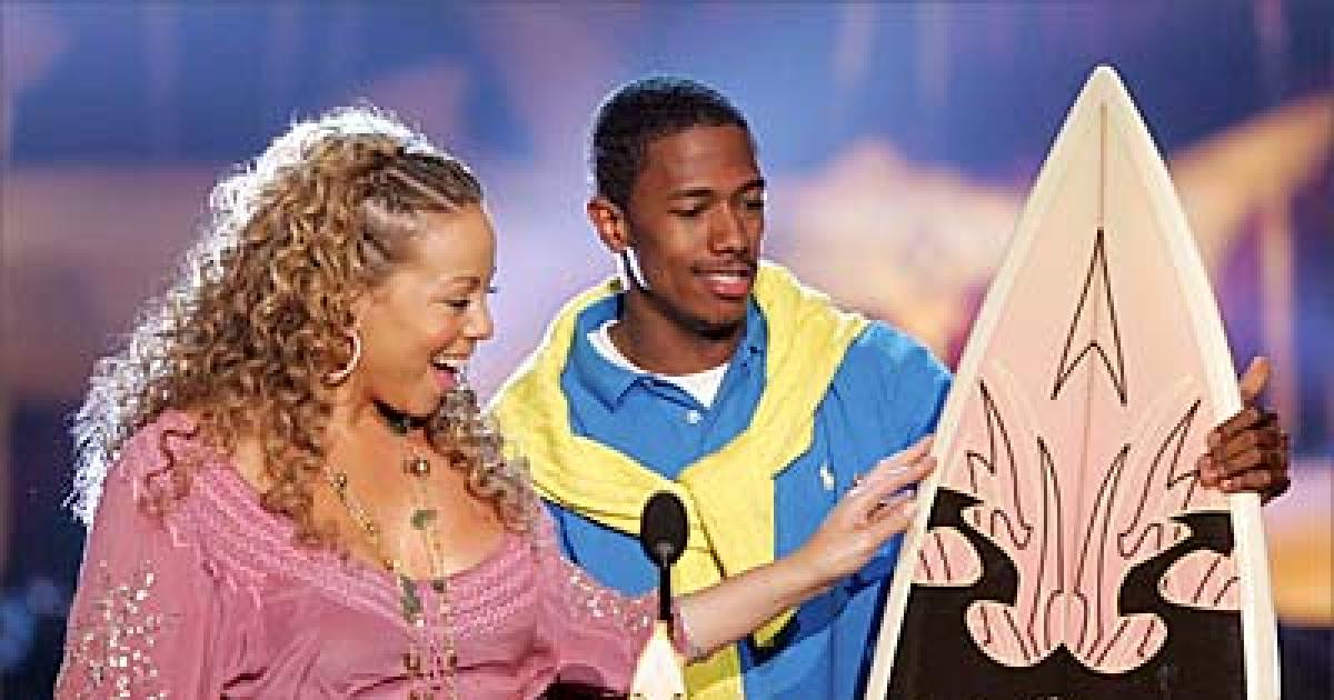 In the picture: Mariah accepts the Choice Music Love Song award with actor Nick Cannon onstage at the 2005 Teen Choice Awards.