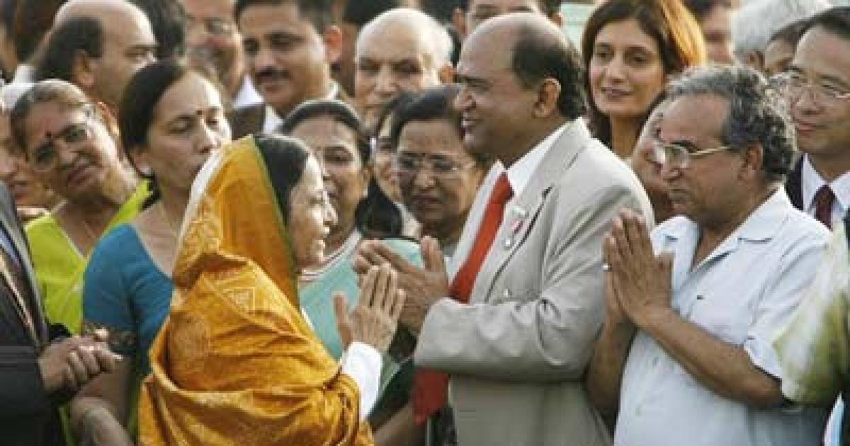 Unlike the At Homes of the last five years, this one is unusual that it has the President's family in attendance. Dr Devi Singh Shekhawat, the President's husband, in whose name the invitation also went out, seems rather lost early in the evening as Sonia Gandhi, Gursharan Kaur, the prime minister's wife, and former First Lady Vimla Devi confer with each other, unused to the presence of a Presidential spouse, and a man at that, in their midst. President Patil's extended family is also present -- a motley crew of women, who like her, cover their heads and kids who are trendily attired.