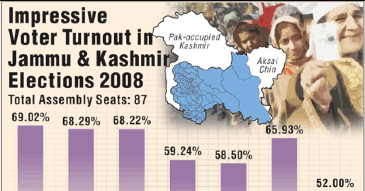The highest turnout was 77 per cent in Chhamb followed by 75 per cent in R S Pura and Akhnoor and 72 per cent in Bishna and Marh.