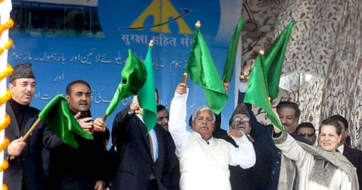 Image: Sonia Gandhi, Lalu Yadav, Ghaulam Nabi Azad and Praful Patel flag off the Train at Mazhom station.