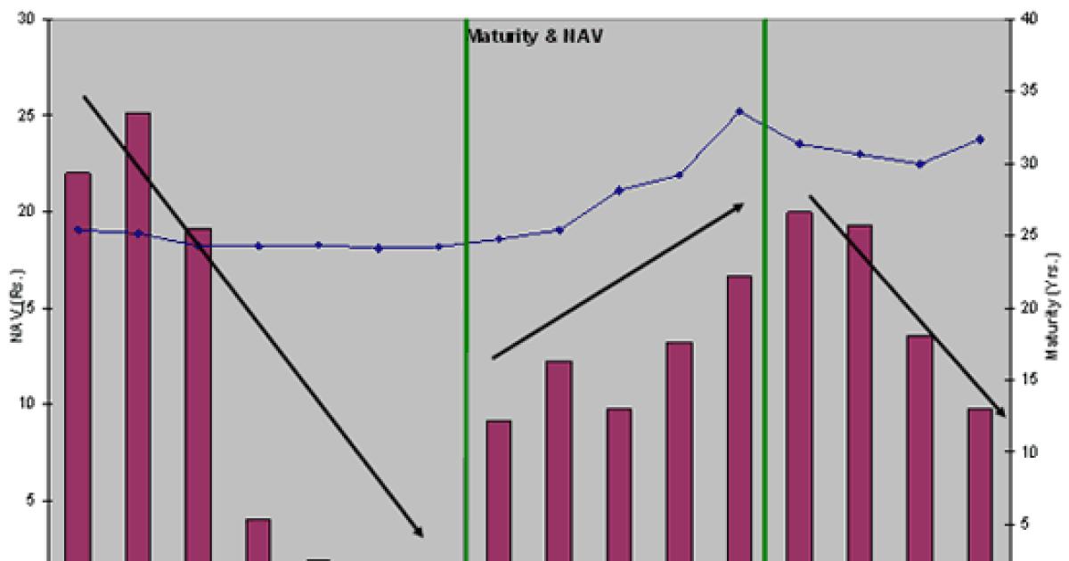 After July 2008, the fund manager consciously raised the maturity of the scheme, as markets started anticipating an interest rate cut. This was also the time when the scheme's net asset value (LINK), NAV, shot up, as can be seen from the blue line in the chart.