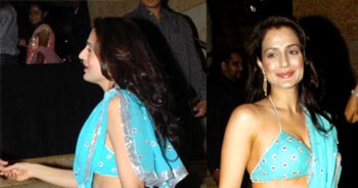 You see, Amisha Patel showed up in a rather commonplace blue sari, but more than the pattern itself, it was the way she had draped it that intrigued us -- the pallav extended only till her elbow!
