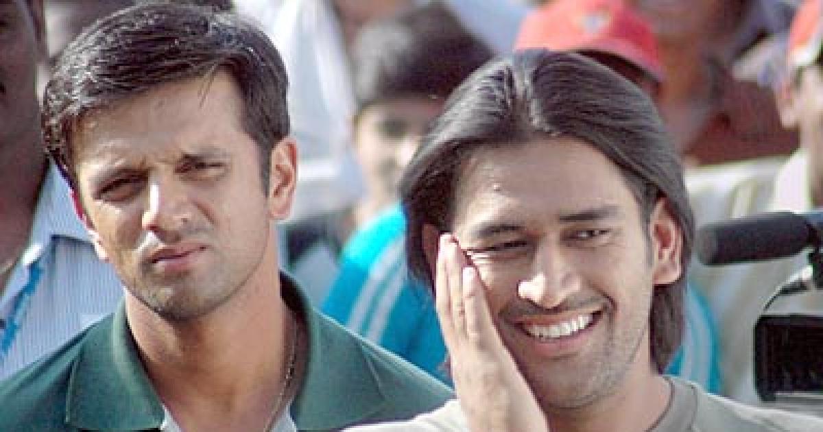 Image: Rahul Dravid and the man who replaced him as India's ODI captain, Mahendra Singh Dhoni, during a shoot for an advertisement in Hyderabad on January 16, 2007. Photograph: Noah Seelam/AFP/Getty Images