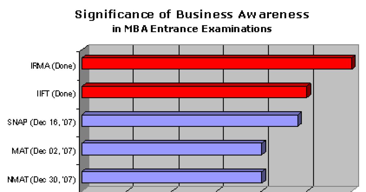 It is apparent from the bar graph that IRMA and IIFT have respectively 30% and 25% questions from the Business Awareness section. Knowing that these two exams for 2007 have already taken place, SNAP, MAT and NMAT are still to happen in December 2007.