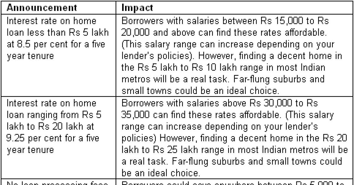 Interest rates on home loans up to Rs 5 lakh have been reduced to 8.5 per cent and rates on home loans ranging between Rs 5 lakh and Rs 20 lakh have been reduced to 9.25 per cent.