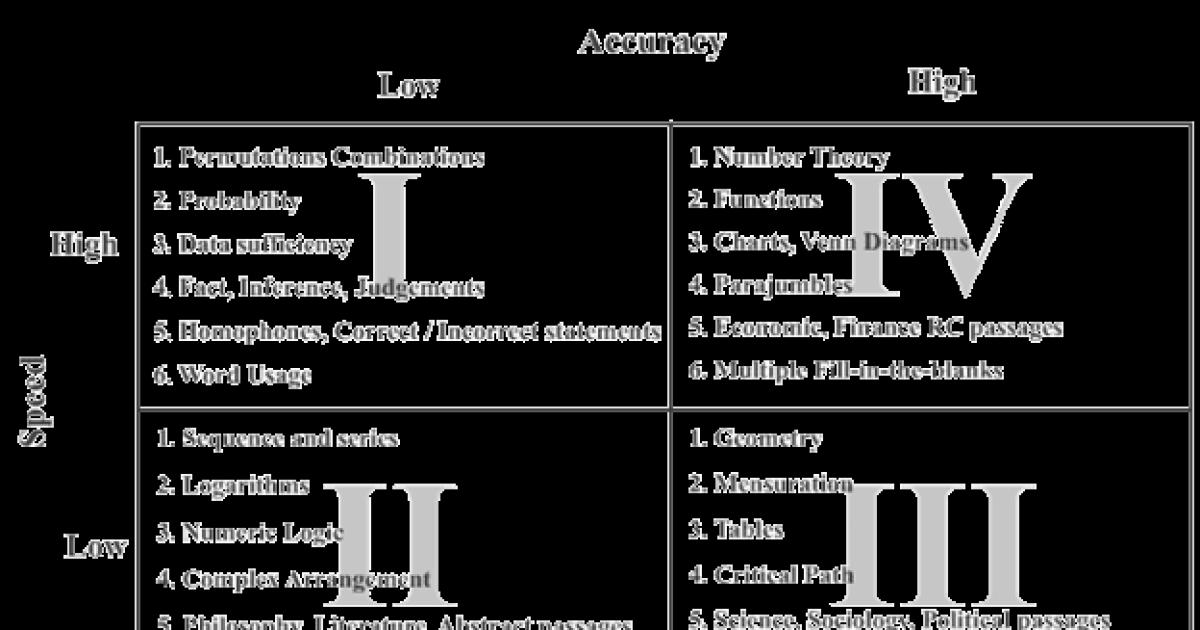 Identify the reasons why you can solve these question types fast, but get them wrong most of the time. It may be because you are hurrying through the question without taking into account a simple but often overlooked idea. Or maybe you are not truly comfortable with the question types, but find them to be easy looking at the question structure only, which tempts you to attempt them. Whatever the case may be, identify the cause, work on it and try and move as may question types from quadrant I to quadrant IV.