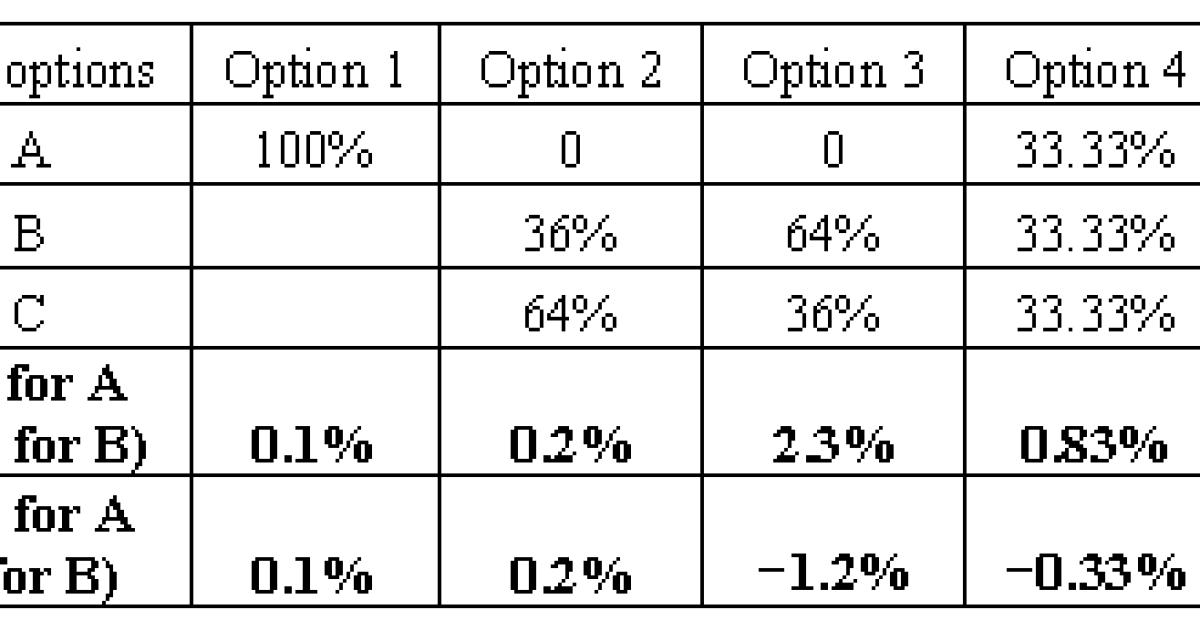 (4) 1/3 in each of the three options (5) 30% in A, 32% in B and 38% in C