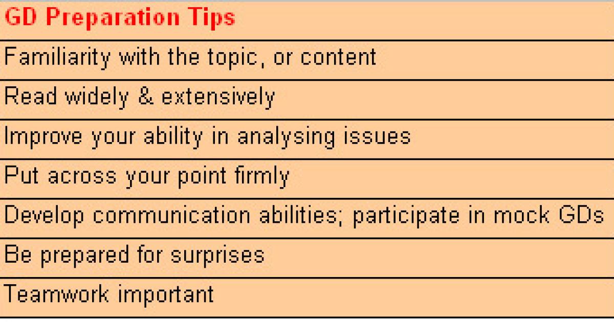 It maybe important to participate in some mock GDs, so that you are able to develop your abilities in communicating effectively in a group. You need to develop your own technique or style in handling people who try to interrupt you, or interrupting others yourself! Practice does help here.