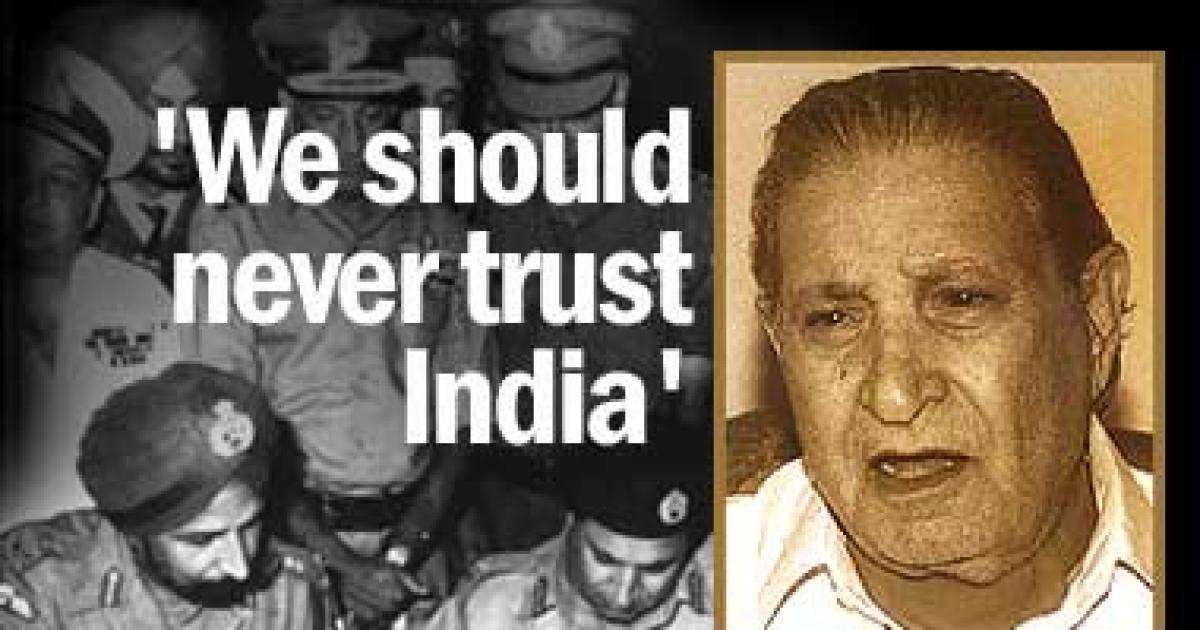 We should never trust India. Successive Indian governments have never reconciled to the idea of a strong Pakistan and have always tried to weaken our country. Previous records show that India has always damaged Pakistan. Whenever they get a chance in future, they would never spare Pakistan. Even now in Kashmir, India has more than hundreds of thousands of troops, killing innocent Muslims in the name of fighting militants.
