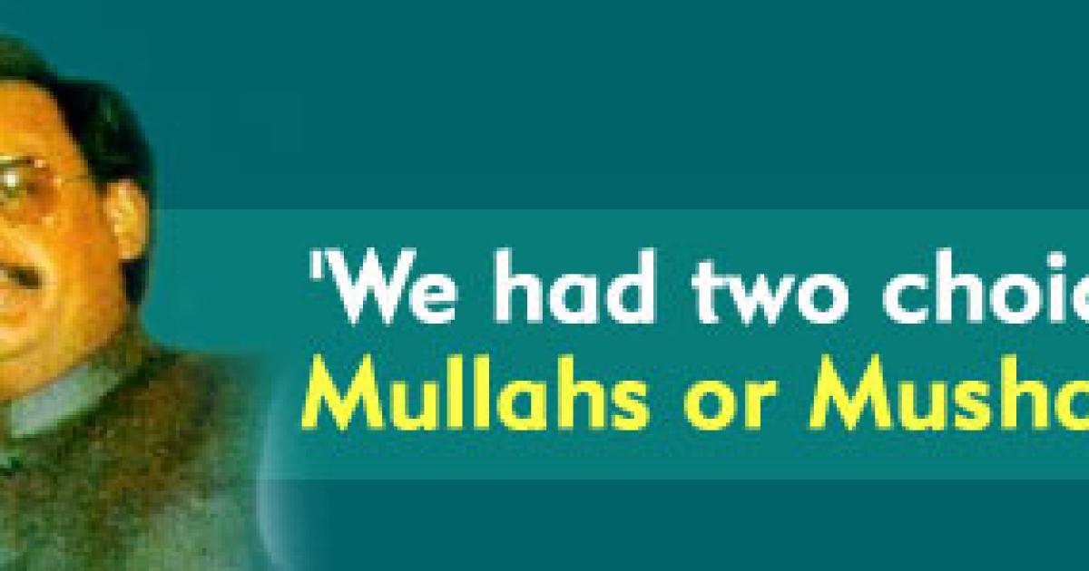 We had only two choices -- either to choose the mullahs or Musharraf. We chose, not happily, you might say (pauses)... a lesser evil. At that time we saw that Musharraf is a liberal person. He is taking action against the religious fanaticism of Al Qaeda. We would not like to go with anyone in vardi (uniform) but we had no choice. We chose the liberal General instead of the religious fanatics.