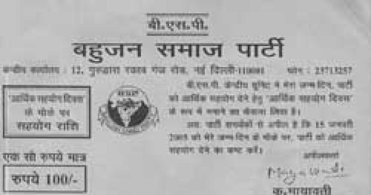 Printed in denominations of Rs 500 and Rs 100, the coupons carry the BSP chief's signature and the message: 'The Bahujan Samaj Party central unit has decided to observe my birthday on January 15 as 'Financial Support Day'. Kindly make your contributions on this occasion.'