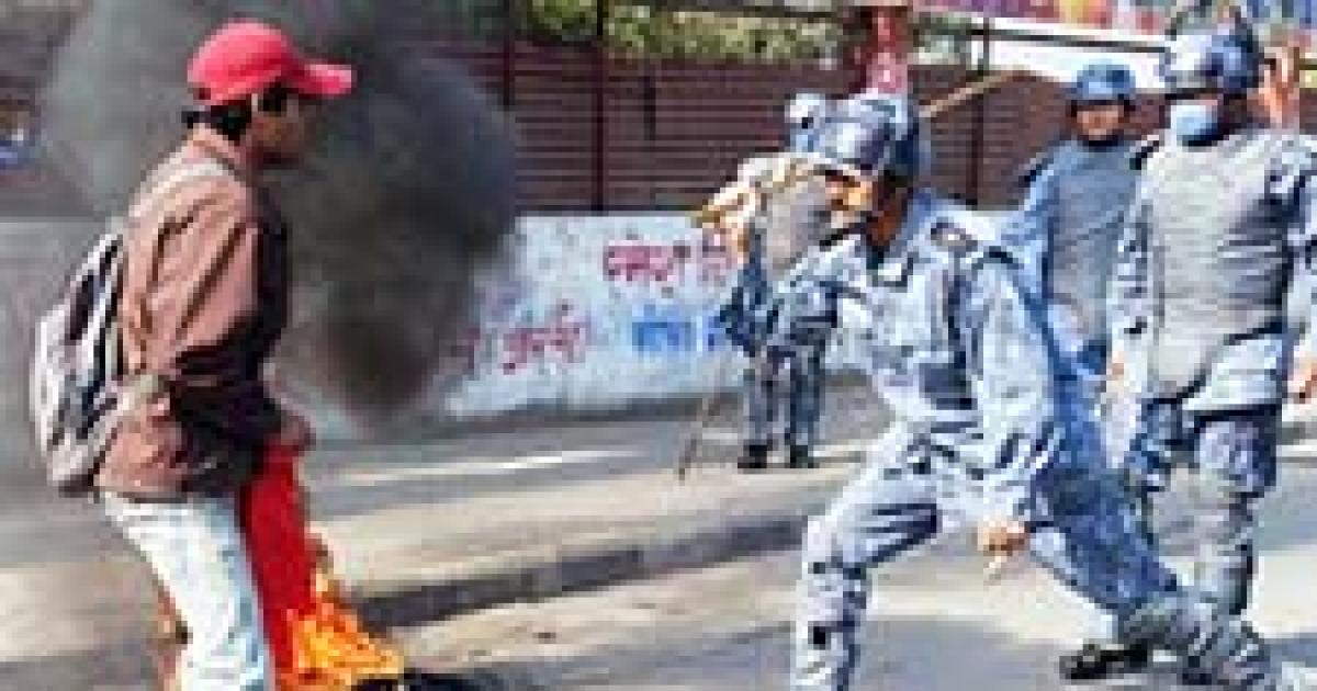 Image: Nepal riot police lathi-charge a student participating in a March 24 protest against the arrest of the head of the Communist Party of Nepal-Unified Marxist Leninist Madhav Kumar Nepal.
