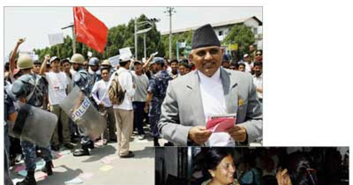 (Top left) A Nepalese Member of Parliament walks past pro-democracy activists shouting slogans while making his way to the country's Parliament in Kathmandu, April 28. Under scrutiny from the people whose weeks of protests swept them back to Parliament, Nepal's legislators returned to the ornate former theatre to begin a new and uncharted political era.