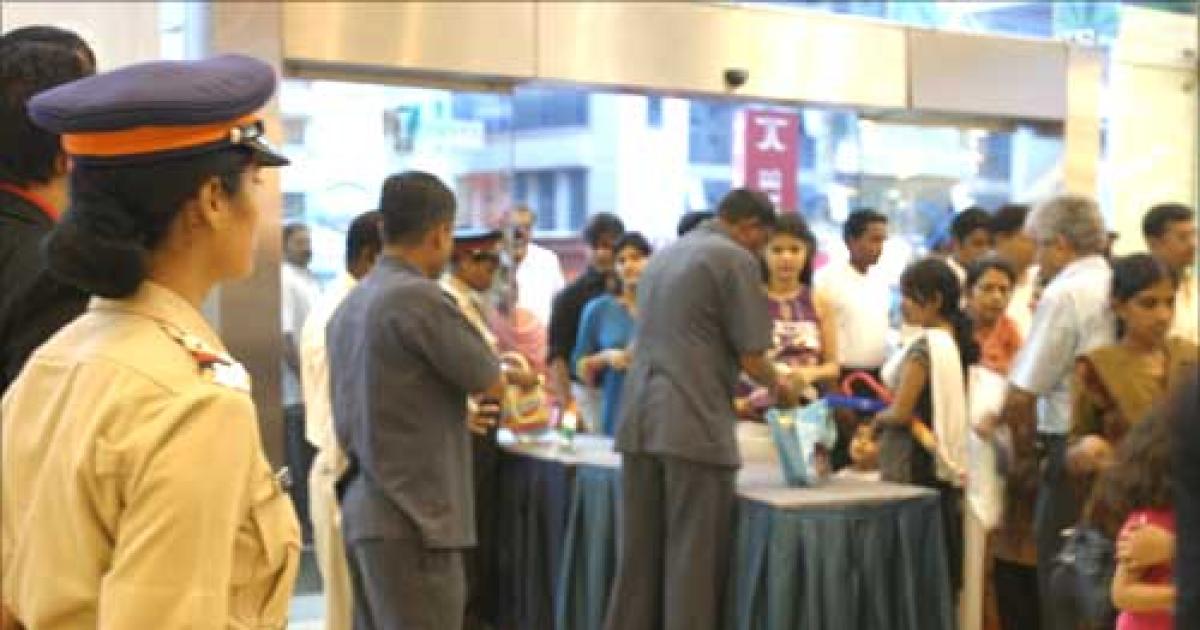 Visitors to a mall in suburban Mumbai undergo thorough security checks, as the country is on high alert on the eve of Independence Day.