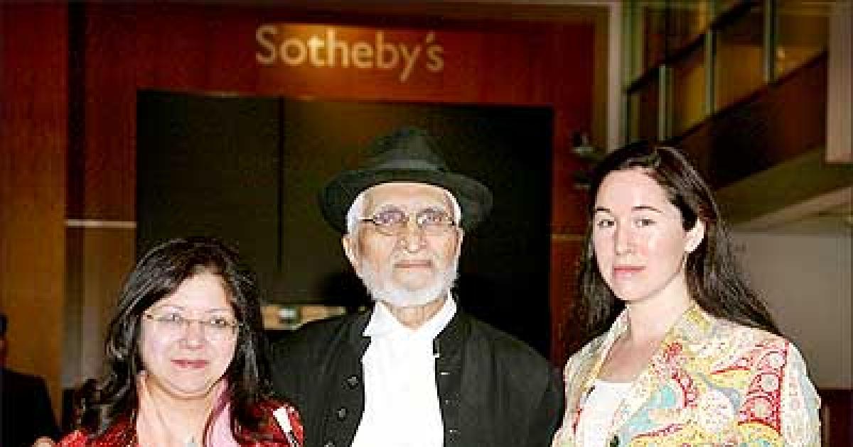 Pictured at the auction (above; left to right) are Rakhi Sarkar, managing trustee of Kolkata Museum of Modern Art (KMOMA), artist M F Husain and Zara Porter Hill, head of the Indian and Southeast Asian Art department at Sotheby's.