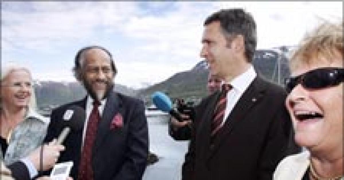 Photograph, right: Dr R K Pachauri, chairman, Intergovernmental Panel on Climate Change, center, with former WHO Secretary General and ex-Norwegian prime minister Gro Harlem Brundtland, extreme right, Norwegian Premier Jens Stoltenberg, second from right, and Norwegian Environment Minister Helen Bjoernoey in Tromsoe, northern Norway, June 4, 2007, ahead of World Environment Day.