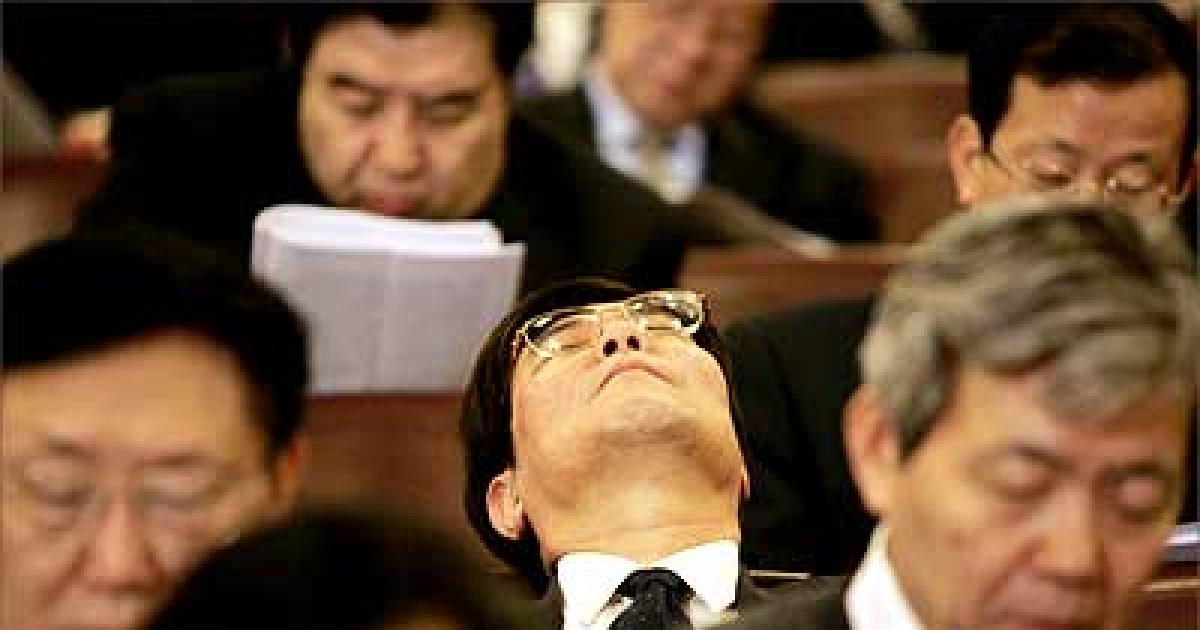 A delegate sleeps as Chinese Premier Wen Jiabao speaks inside the Great Hall of the People at the start of the annual session of China's Parliament in Beijing, March 5.