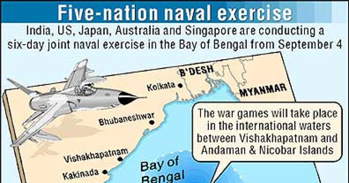 The sea manoeuvres in which battleships from India, America, Japan, Australia and Singapore took part is aimed at tackling multi-threat scenario like missile, submarine and aerial attacks.