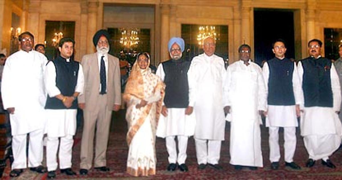 Image: President Pratibha Patil and Prime Minister Manmohan Singh with newly inducted Ministers at the oath taking ceremony at Rashtrapati Bhavan in New Delhi on Sunday.