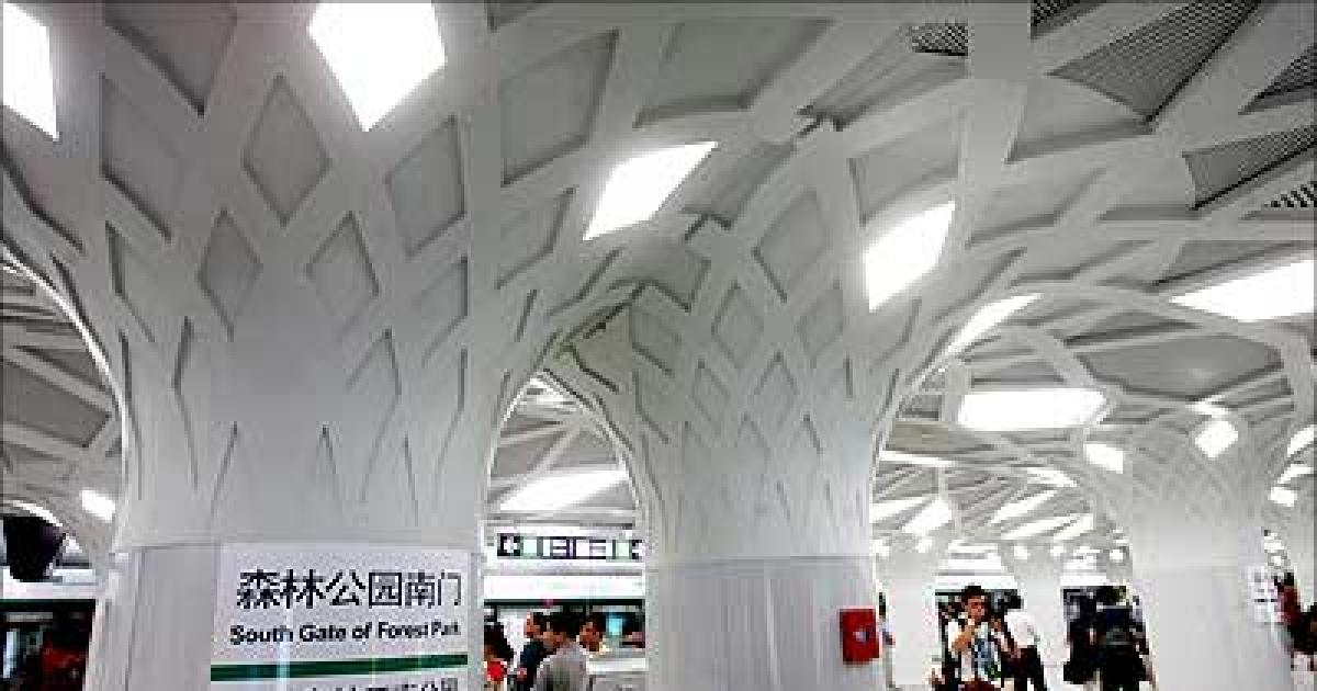 Image: The Olympic Forest Park South Gate station at Beijing's Olympic Branch Line. The city opened two new subway lines and air airport link for the Beijing Olympics. Photo: China Photos/Getty Images