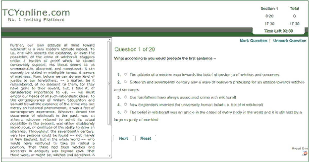 As you can see from the screen shot, to your left is the passage and to the right is Question No 1 out of a total 20 questions. The "NEXT" button helps in moving ahead to the subsequent questions if a question is done or is to be left un-attempted.